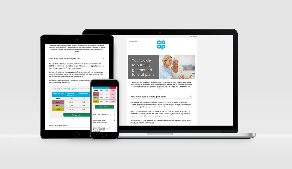 Following on from the inclusion of interactive elements in their Membership emails, Co-op needed to condense a lot of information in this Funeral Care email. A dropdown function was designed and built for this email with a fallback provided that would just stack the content on clients that didn't support the interactivity.