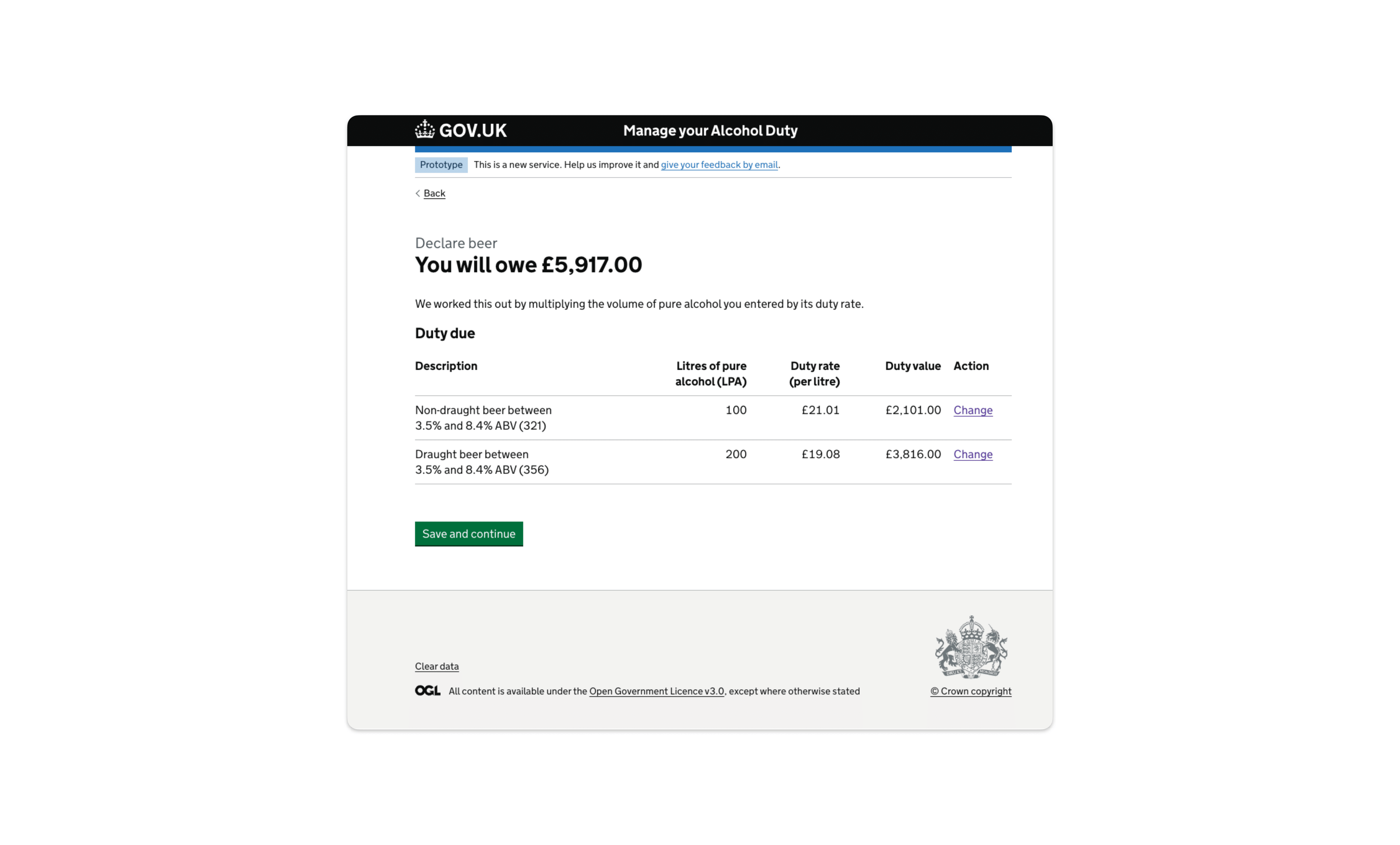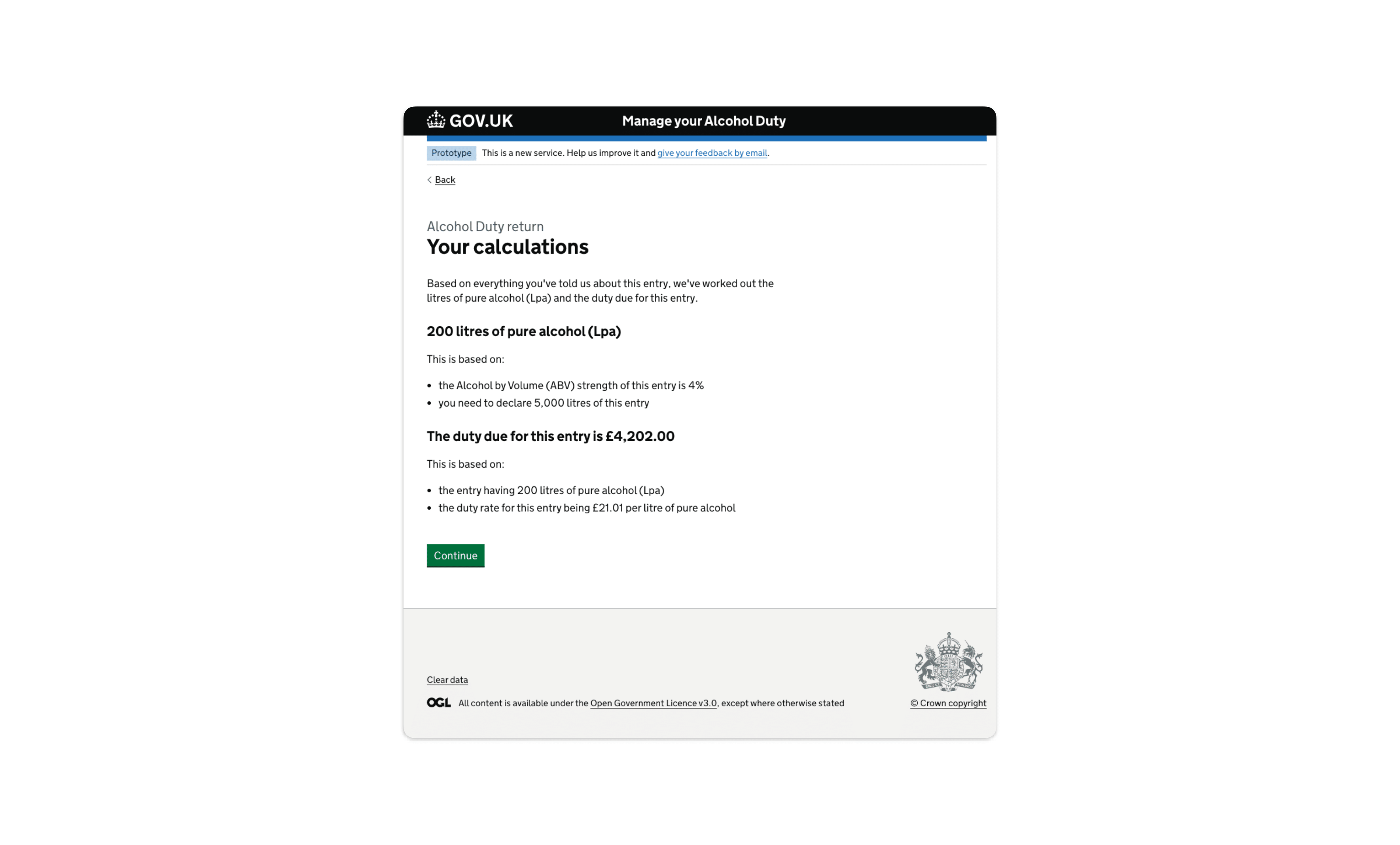 The service would ask the user to input the ABV of the product they were reporting and based on this and their approval type, would work out the relevant tax rates that could be applicable and present these back to the user to select the correct one. Once the user had selected the correct one and inputted the production volume, the service would then work out the total of pure alcohol and multiple this by the applicable tax rate, meaning that the user didn't need to do any of the calculations.